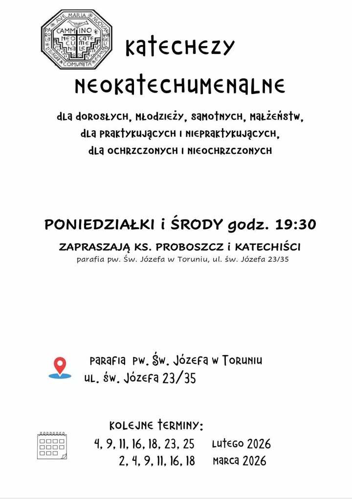 Rozpoczęły się w naszej parafii katechezy neokatechumenalne dla dorosłych i młodzieży, zapraszamy w każdy poniedziałek i środę o 19.30 do kościoła. Przyjdź, posłuchaj i zobacz. To spotkanie z żywym Bogiem i ludźmi, którzy rozmawiają o życiu, sensie i Bogu – bardzo normalnie, bez zmuszania i deklaracji. To czas słuchania dla tych, którzy mają pytania, wątpliwości, byli lub są daleko od Kościoła. Przyprowadź męża, żonę, sąsiada, sąsiadkę, kuzyna lub kuzynkę, kolegę czy koleżankę lub osobę, która już dawno odeszła od Kościoła. Przyjdź i posłuchaj! Zapraszają o. Proboszcz i ekipa katechistów.