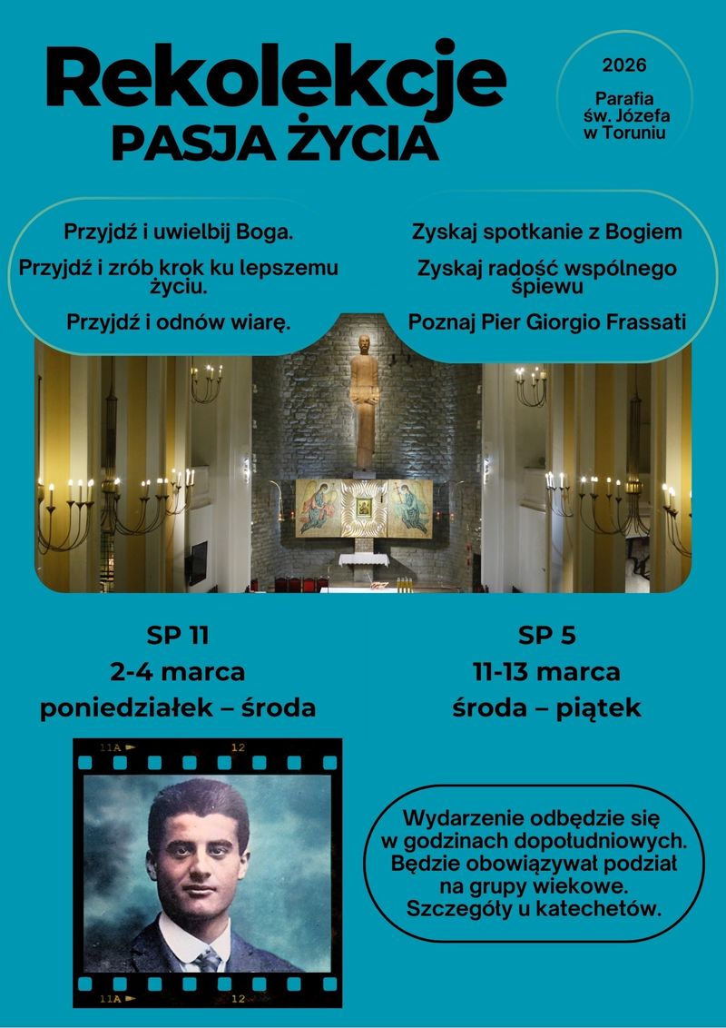 Zapraszam uczniów szkół podstawowych znajdujących się na terenie naszej parafii do udziału w rekolekcjach wielkopostnych. To wyjątkowy czas na spotkanie z Bogiem, wspólną modlitwę i poznanie postaci bł. Pier Giorgio Frassatiego.